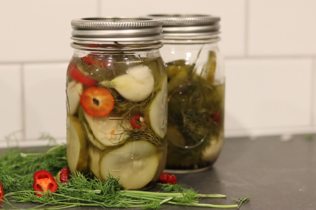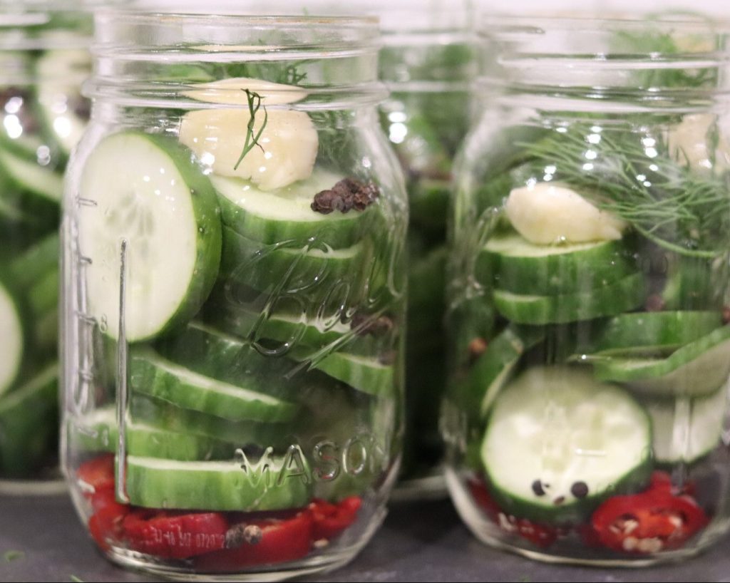- Add the cucumbers and fresno chilis to the 5 jars. Make sure to leave room for the brine so do not pack them too tightly.