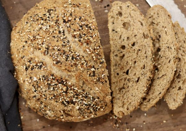 I love bread. It has always been my weakness. This is a super simple recipe with only 5 ingredients and no kneading! Just mix the dough, let it sit overnight, and bake. I add EBTB to the actual dough and crust of the bread to give it even more flavor and a delicious salty crust. It is YUM!